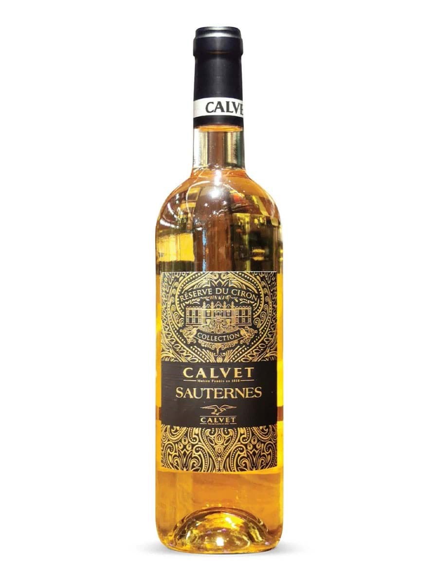 Rượu vang ngọt Calvet Sauternes được làm từ sự pha trộn 3 loại nho Semillon, Muscadella và Sauvignon Blanc. Rượu có màu vàng thu hút. Đây là một loại rượu vang ngọt tuyệt vời với hương vị trái cây của mơ, cam, quýt, đặc biệt là sự cân bằng tốt giữa độ axit và độ ngọt tự nhiên trong trái nho.
