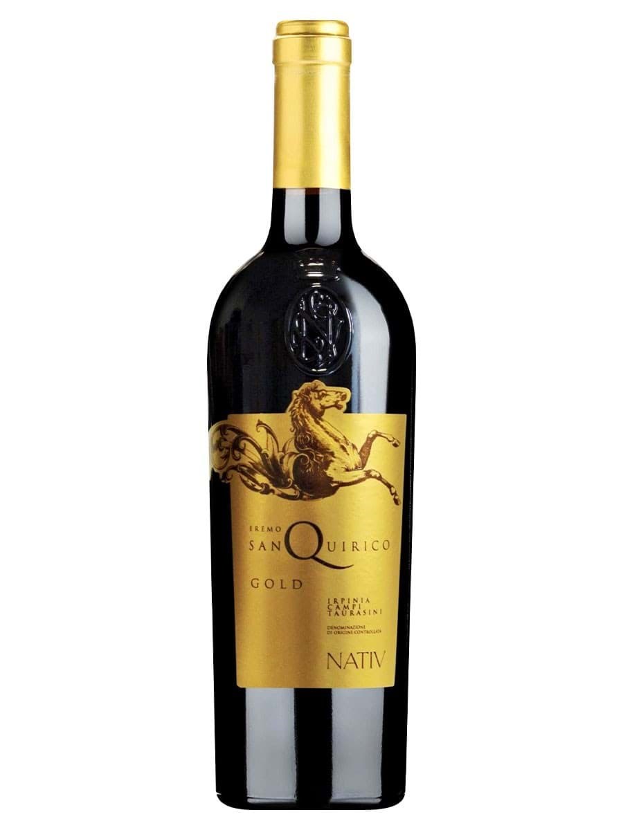 Rượu vang đỏ Nativ Eremo San Quirico Gold, được làm từ 100% nhp Aglianico, vùng Campania, Ý. Nho được thu hoạch thủ công cho sản xuất, sau khi lên men, rượu được ủ 12-18 tháng trong thùng gỗ sồi Pháp mới 225L.