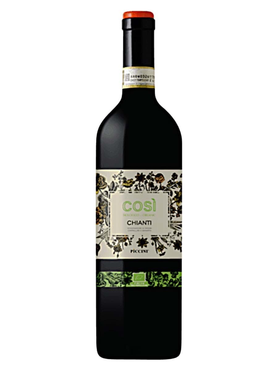 Rượu vang Piccini Cosi Chianti Organic, được làm chủ yếu từ giống nho Sangiovese, vùng Tuscany, Ý. Rượu có màu đỏ ruby mở ra với mùi hương lôi cuốn đặc trưng của Sangiovese, anh đào đen, quả lý chua đỏ và một chút hương hoa violet. Trong vòm miệng, vị ngon ngọt với tannin mượt mà hòa quyện với hương vị trái cây khi kết thúc.